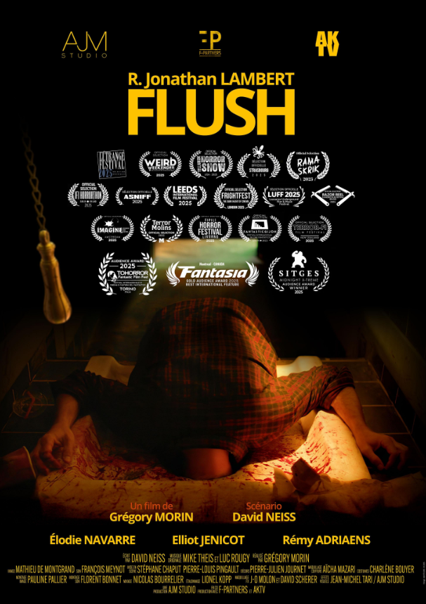 Le duo aux commandes n’est autre que celui qui signa le fameux, en son temps, Paris By Night of the Living Dead (court de 2009), à savoir David Neiss (au scénario) et Grégory Morin (mise en scène). Unité de temps, de lieu, d’action : on passe les 70 minutes du métrage dans le décor unique de la cabine de toilettes. Mais pas question de s’ennuyer ! Les auteurs se sont creusé la tête pour rendre la situation plausible et toujours trouver quelque chose qui relance l’histoire et nous fait rire des malheurs du personnage, bien amoché et le nez dans la merde. Jamais notre héros ne se décourage dans sa quête de l’astuce qui lui permettra de relever la tête et sortir du trou, au propre comme au figuré car il essaie en même temps de résoudre une situation familiale compliquée. Une véritable épopée en huis clos qui, depuis l’an dernier, fait la tournée des festivals (avant Gérardmer, Flush est passé par Fantasia au Québec, par l’Étrange Festival et le PIFFF en France, par le Lausanne Underground Film Festival en Suisse, etc.). Les auteurs étaient là pour présenter le film, accompagnés de la comédienne Élodie Navarre.