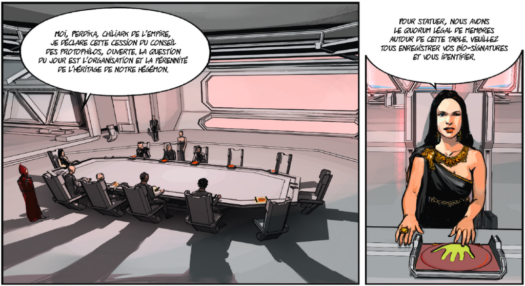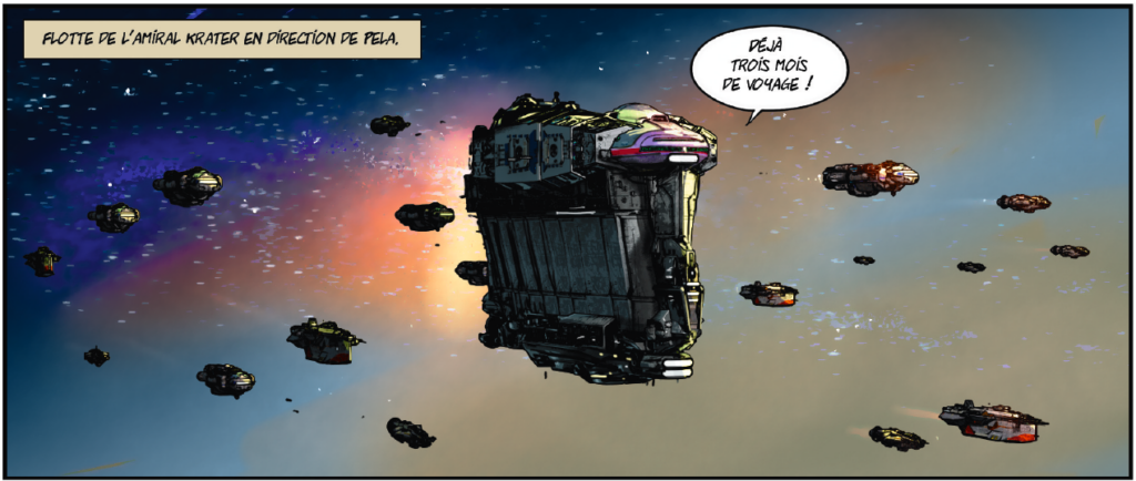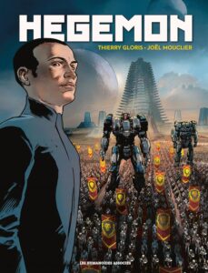 Les échelles de temps et d’espace donnent le vertige, mais tout compte fait, le désir de pouvoir et de conquête des différents acteurs de ce space opera nous renvoient aux mesquineries les plus étroites des intrigues de palais telles qu’on les connaît, en France et ailleurs, depuis que le monde est monde. Les alliances se font et se défont, on manœuvre et complote à tout va, et lorsque l’empereur moribond finit par casser sa pipe, une lutte âpre s’engage pour prendre sa succession. Historien de formation et scénariste de BD chevronné, Thierry Gloris s’est lancé avec cet album dans le genre, nouveau pour lui, de la science-fiction. L’occasion pour lui de placer une collection d’ingrédients typiques du genre, quel que soit le support — littérature, cinéma, animation, manga… Les planches de ce one-shot débordent de vaisseaux spatiaux énormes, d’armures et de robots de combats, pas mal de trucs explosent avec moult grand bruit, le tout dans le cadre d’un empire galactique digne de Dune ou de Star Wars. Visuellement, c’est plus d’une fois impressionnant, mais pas toujours passionnant (les messes basses comme les négociations officielles pour désigner le nouveau potentat sont un peu lassantes à la longue), et il faut bien dire aussi que l’accumulation de bourdes d’orthographe dans les bulles finit par rendre la lecture agaçante. M’enfin, au su de tout cela, et si vous êtes séduit par le graphisme accrocheur du dessinateur à l’œuvre, Joël Mouclier, vous pouvez tout à fait décider de faire de cet Hégémon votre prochain achat de BD.