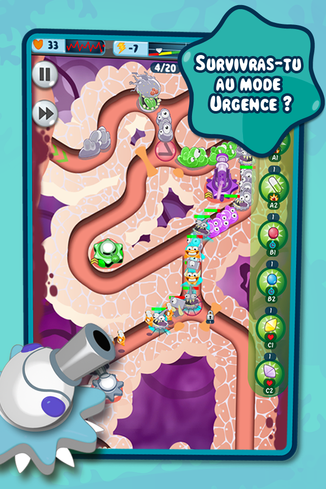 Autre originalité, le mode d’acquisition des ressources. Eliminer les virus ne donne aucune somme d’argent ou point d’expérience pour acquérir de nouvelles tours ou améliorer celles en place. Au milieu des vagues d’attaquants, se trouvent régulièrement une vague de protéines. Ces dernières sont absorbées par les tours pour finaliser leur construction.