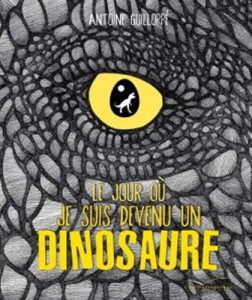 Au fil des pages, le jeune TyRex nous entraine dans un monde aujourd’hui disparu à la rencontre de spinosaure, brachiosaure, quetzalcoaltus, stégosaure et tricératops (que le jeune lecteur pourra identifier fort heureusement à la fin de l’album). Un texte court tout en lettres dorées, du gris et des touches de couleurs (vert, rouge) pour qu’Antoine Guilloppé nous conte une drôle d’histoire qui plaira beaucoup aux jeunes lecteurs