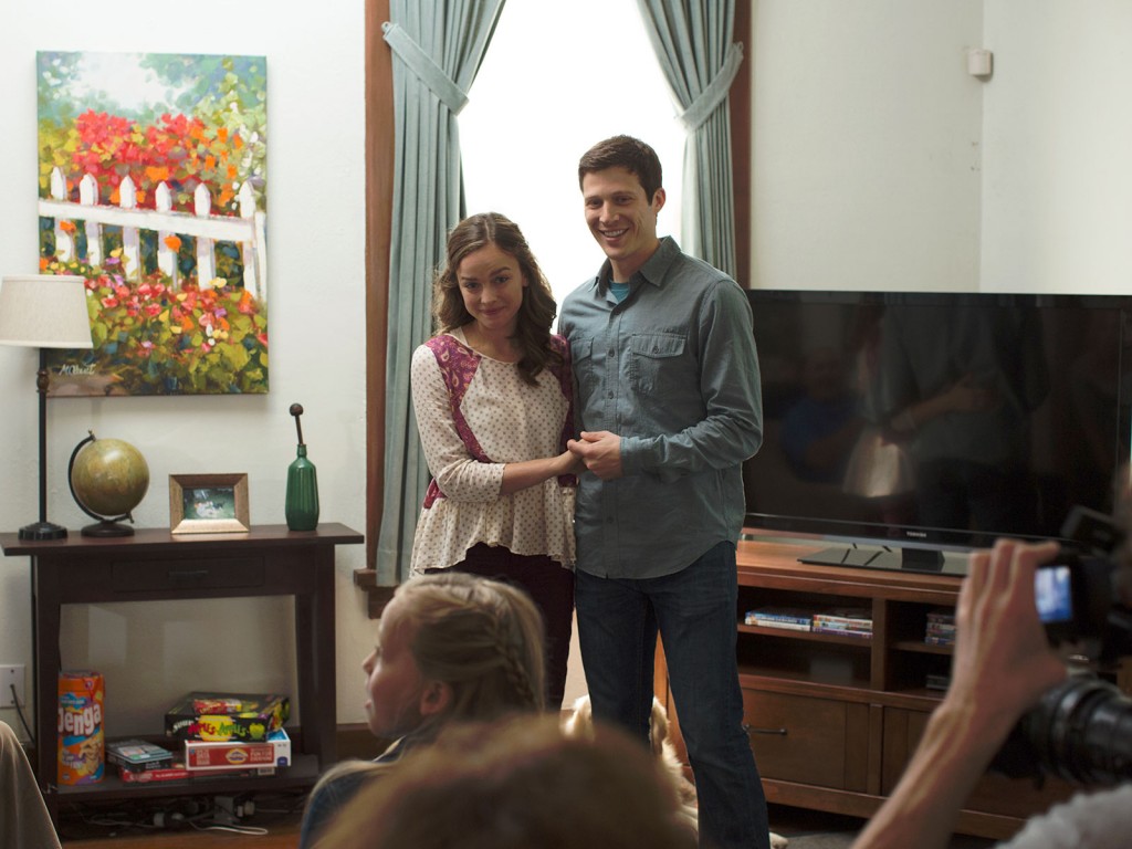 Cet ersatz de Rosemary’s Baby a été tourné par deux membres du collectif Radio Silence, auteur du dernier segment du film à sketches V/H/S. La bande annonce, si vous l’avez visionnée avant de lire ces lignes, vous aura fait comprendre que nous sommes en présence d’un énième found footage : le mari Zach a une lubie, filmer les moindres faits et gestes de son couple, histoire de tenir un journal de bord vidéo à transmettre à ses descendants. Sa gentille épouse n’y trouve rien à redire, donc rien ne nous est épargné : les vingt premières minutes sont consacrées à la journée des noces (avec le passage devant l’autel, les discours des témoins et patati et patata… c’est passionnant !), au voyage exotique (plage, exploits en tyrolienne…). Malgré le caméscope comme greffé au poing du mari, le couple ne baise pas devant l’objectif (eh non !), et l’épisode où Sam est engrossée par on ne sait quelle entité démoniaque ne nous est transmise que par bribes. Le spectacle reste par conséquent très prude et, surtout, il suit les rails d’un scénario balisé par des séquences déjà vues mille fois (la séance d’échographie inquiétante, la future maman, végétarienne, prise de fringales de viande crue, etc.). La monotonie n’est fugacement brisée que par les quelques scènes où intervient le Père Thomas, qui marie le couple en début de métrage. Tout comme le chien de la maison, monsieur le curé sent qu’il y a un truc qui cloche, et le Malin s’emploie à signaler sa présence en rendant le prêtre malade à chaque fois qu’il croise la route de Sam. Des séquences assez bien emballées mais qui, au final, ne débouchent pas sur grand-chose (l’ecclésiastique ne se fait pas exorciste et se contente d’un rôle de second plan). Le climax des dernières minutes, lorsque l’héroïne songe enfin à accoucher, ne suffit pas à relancer l’intérêt, depuis longtemps dilué par les innombrables séquences de remplissage communes à la plupart des productions de série filmées façon « documenteur ». Un détail cocasse : la secte satanique qui fait le malheur du couple signe ses méfaits d’un graffiti hermétique ressemblant à s’y méprendre au symbole monétaire de l’euro ! C’est très con, vraiment. Regardez l’affiche du film si vous ne me croyez pas.