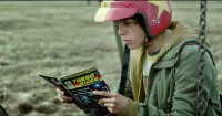 Conçu dans cet esprit, Turbo Kid s’impose comme une belle petite épopée post-apo. dont les prémisses furent un court métrage, T is for Turbo (tourné avec les moyens du bord dans le but de briguer une place dans l’anthologie The ABCs of Death). Nous sommes dans le futur, soit en… 1997 ! La planète n’est plus qu’un champ de ruines pollué, l’eau une denrée rare. Dans un coin de ce qui fut le Canada circule le « Kid » (Munro Chambers), post-ado fan de comics qui, comme tout le monde, se déplace à vélo (il n’y a plus de pétrole non plus). Non loin sévit Zeus, petit potentat machiavélique gardant le secret d’une mystérieuse source d’eau potable. La vie du Kid bascule lorsque, par un beau jour gris dans le no man’s land, il fait la rencontre d’Apple, blonde, charmante, pétillante et surtout very high-tech — c’est un robot !
