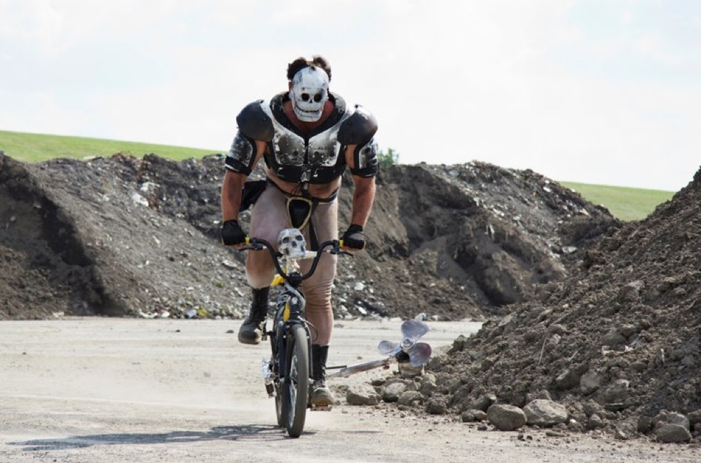 Les auteurs sont donc canadiens : François Simard et les frangin-frangine Anouk et Yoann-Karl Whissel. Un trio comblé car leur film a collectionné les récompenses dans moult festivals où il a été programmé. Car c’est un fait : les spectateurs aiment Turbo Kid. Non seulement parce qu’ils le trouvent réussi, mais aussi parce qu’ils éprouvent de l’affection pour le film, une œuvre limitée en termes de moyens (le budget de tournage était modeste, cela se voit) mais portée par l’imagination fertile et l’enthousiasme communicatif de ses auteurs. En somme, une foi énergique qu’on retrouve tout entière dans le personnage d’Apple, la gentille androïde, personnage qui aurait pu sombrer dans le cliché (des jolies « robotes », on en a déjà vu plein) mais qui y échappe prestement. La bande de cinéastes a eu le génie de confier le rôle à une comédienne qu’on prend illico en sympathie, Laurence Lebœuf, au visage et aux grands yeux merveilleusement expressifs. On aime Laurence, on aime que le Kid aime Laurence, et on suit avec un plaisir gourmand leur combat sur bicross contre cette vieille baderne de Michael Ironside, qui joue Zeus, le super-méchant, avec une joie elle aussi contagieuse. Simard & Co lui ont adjoint une crapule masquée bien lookée, au regard fou (photo ci-dessous), qui file accomplir pour lui les basses besognes (car non, les réals n’ont quand même pas eu le culot d’imposer à Ironside de poser lui aussi les fesses sur une selle de BMX !).